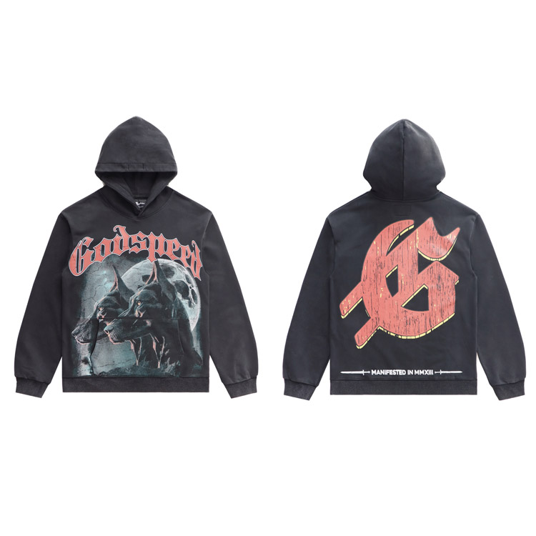 Godspeed Dog Head Print Washed Distressed Loose Hooded Sweatshirt-4573