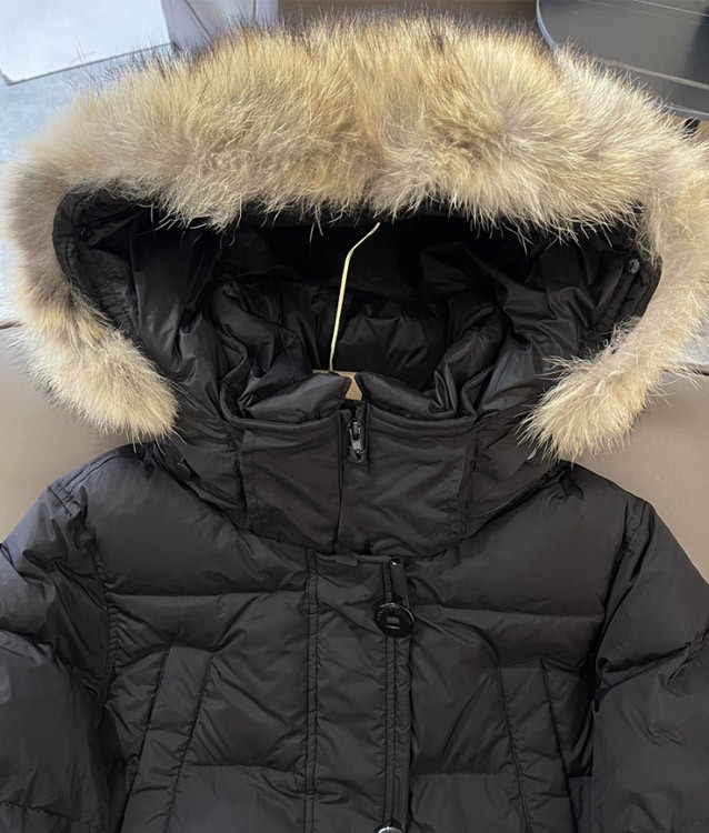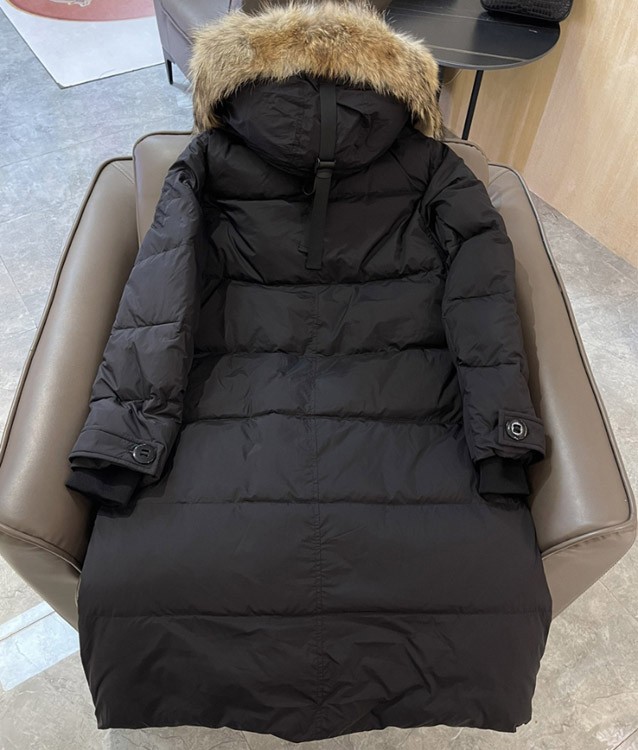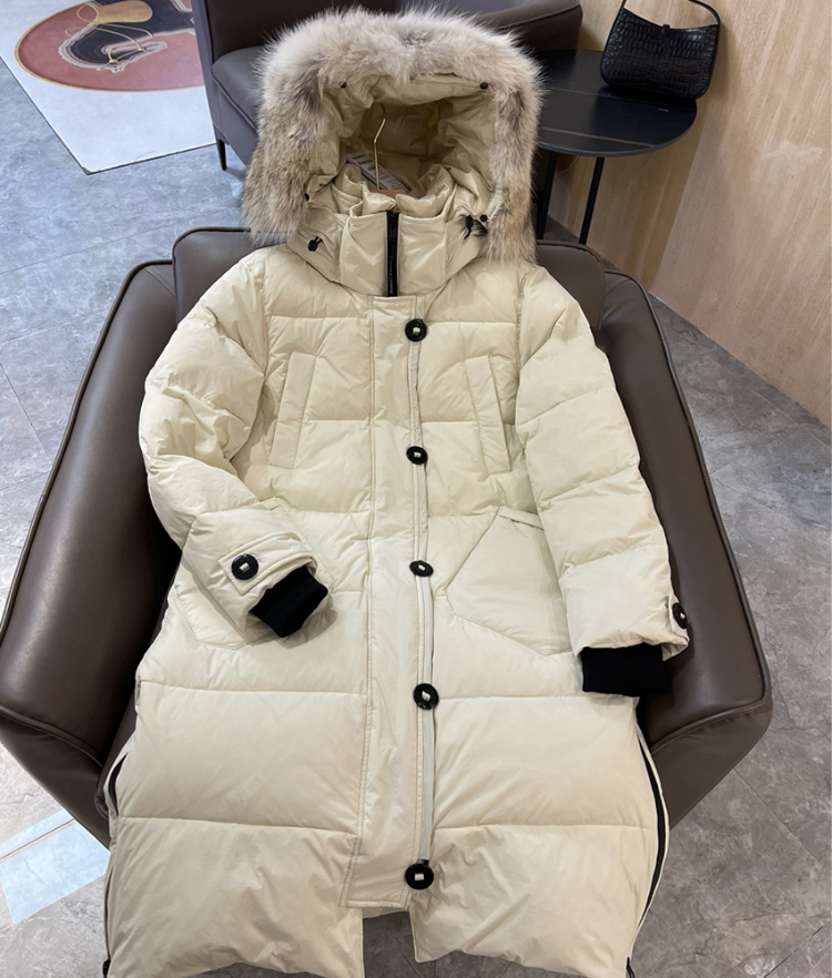 Thick and warm long down jacket with goose embroidery badge and hood-5343